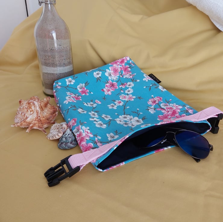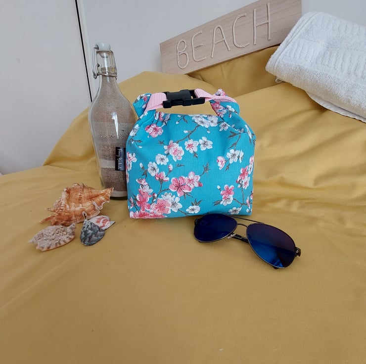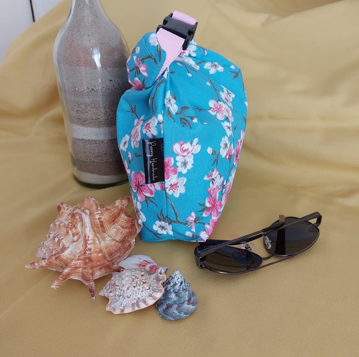small drybag measuring 30x27cm with boxed corners at 7.5cm. outer is a coated cotton canvas fabric inner is a navy blue rubberised waterproof fabric. handle inside to assist with drying after use