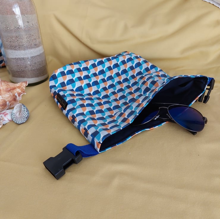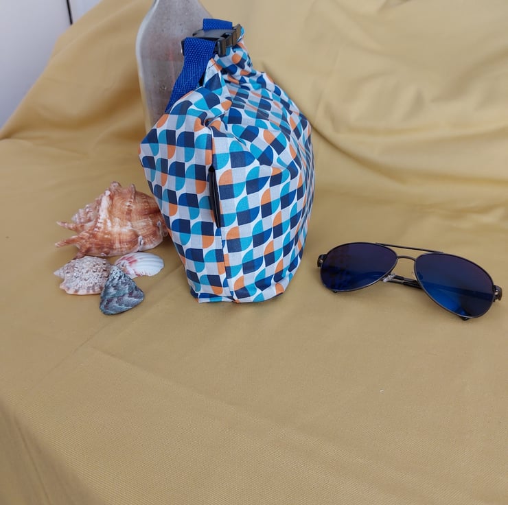 small drybag measuring 29x29cm with boxed corners at 7.5cm. outer is a coated cotton fabric, inner is a navy blue rubberised waterproof fabric. handle inside to assist with drying after use