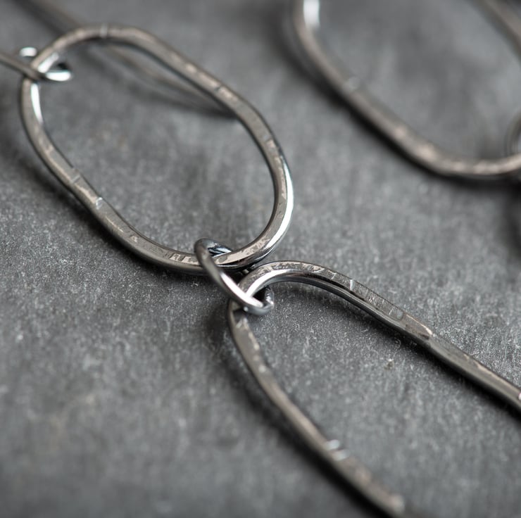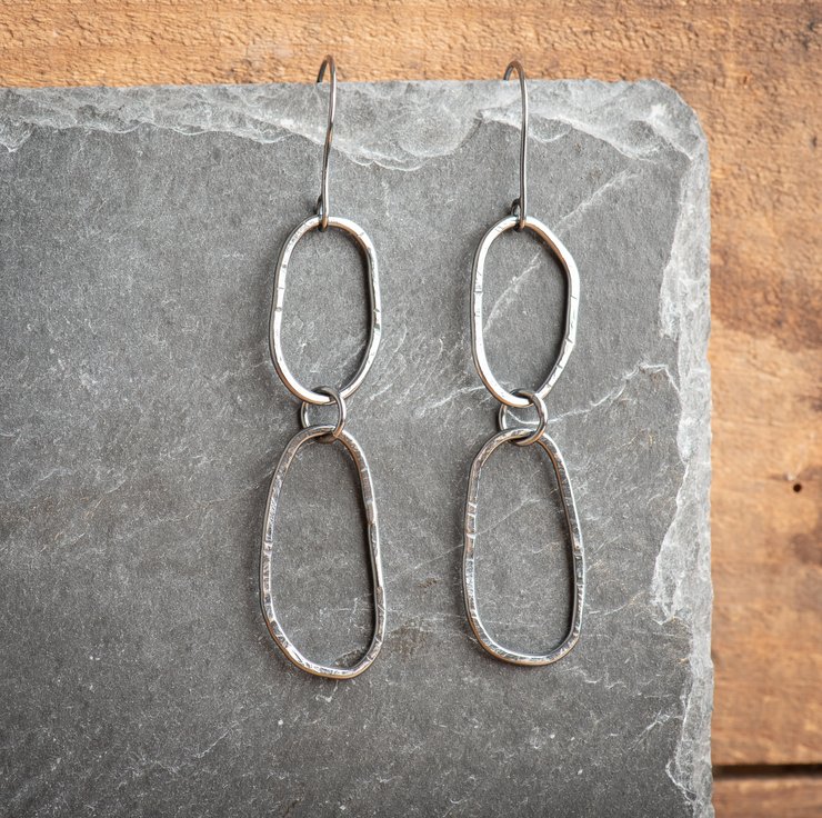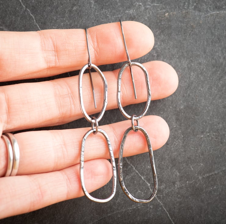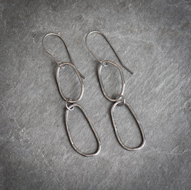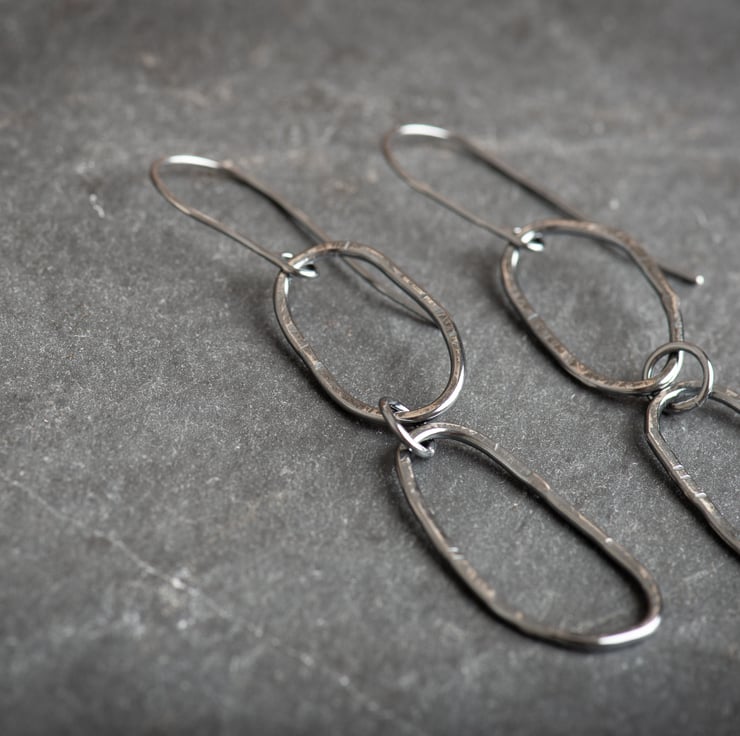 To make these earrings I have hand formed wire into abstract shapes, soldered, and textured each piece. The earring wires are also handmade from sterling silver, and I have oxidised the earrings to darken. This patina has been polished away slightly to show off the textures.