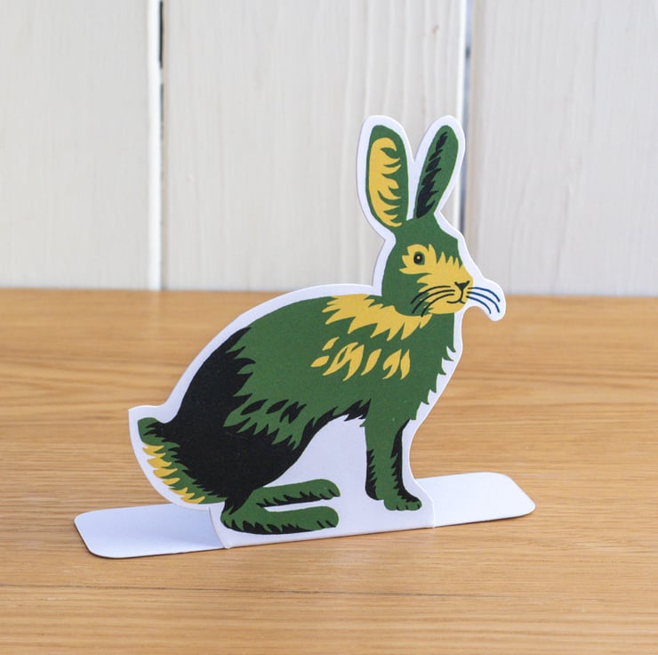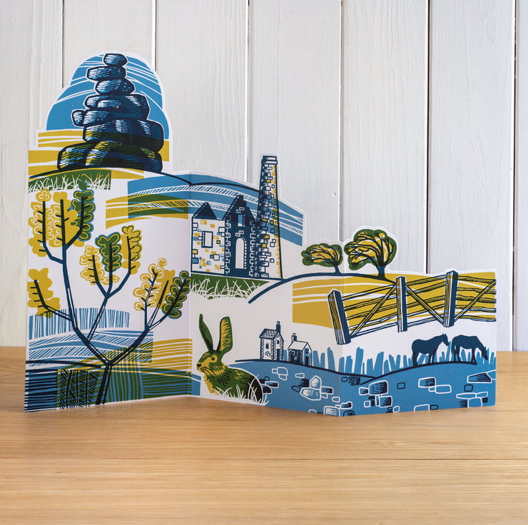 It features a rock tor, a tin mine, gorse, wind blown trees, a dry stone wall, fence, wild horses and a hare. The card is double sided so you can display it either way around. It also comes with a stand up hare which you can display with the card or separately.