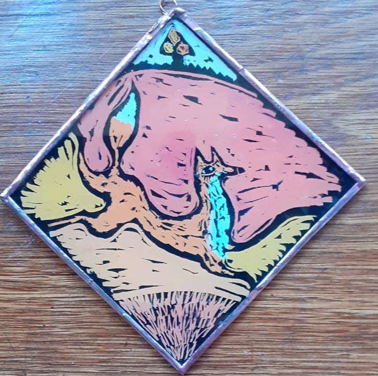 Made using the reverse glass painting technique where the back of the glass is painted black then etched out. The colours are then added behind.