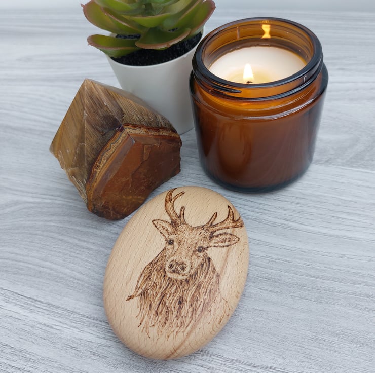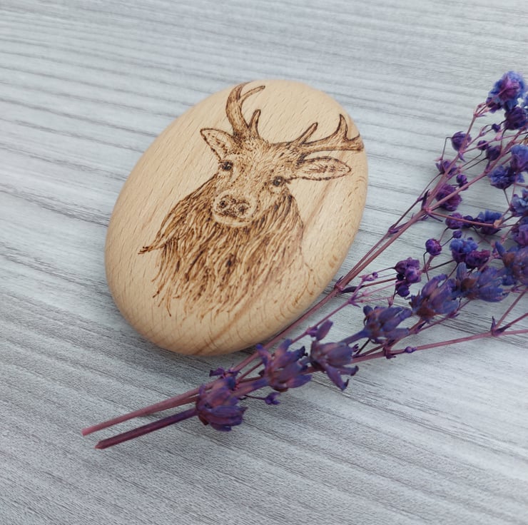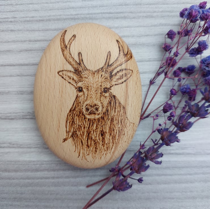 This stag has been drawn and burned using the technique of pyrography onto a British hardwood pebble. It's finished with artists satin varnish. I draw these directly onto the pebbles so each one is unique.