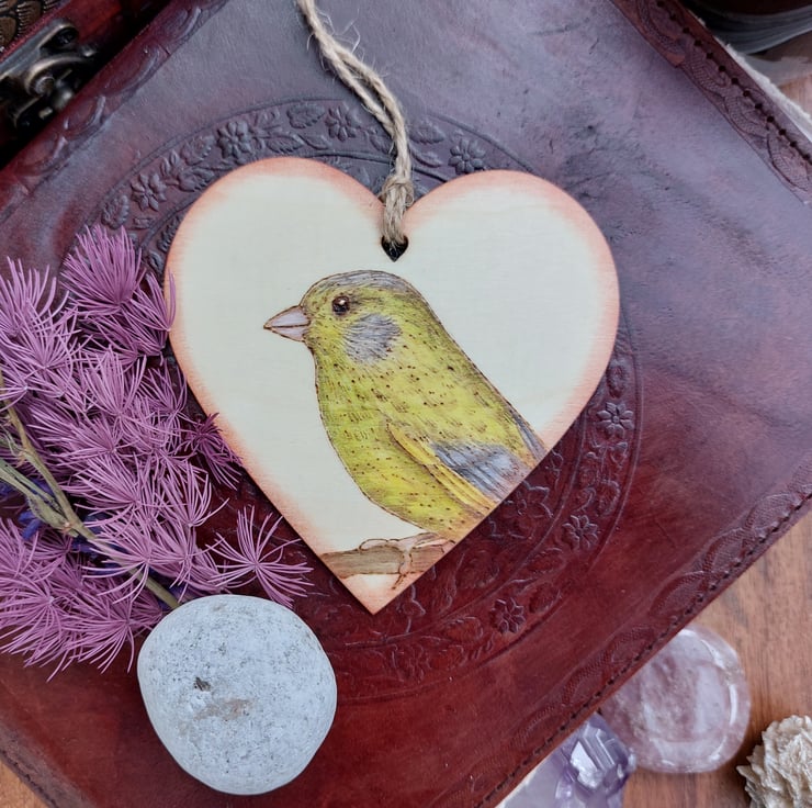 This little illustration in my series of British birds is a greenfinch, inspired by one of the many who visit my garden feeders. It's created using pyrography, which is burning on wood, and coloured using acrylic inks. It's finished with satin artist varnish.