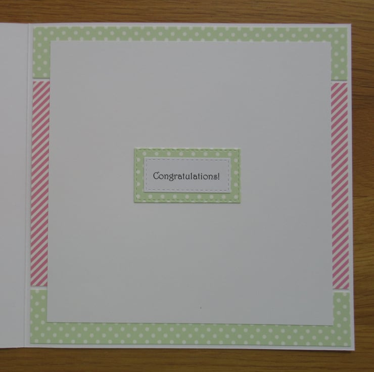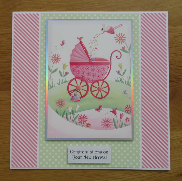 This is a pretty card in a pink and lime green colourway, ideal for a new baby girl. The image features a fairy sprinkling fairy dust over a new baby girl in a pretty pink pram and has a frame of silver mirror card. It has been raised with 3D foam pads, as has the greeting and the inside has been finished to coordinate with a congratulations message.