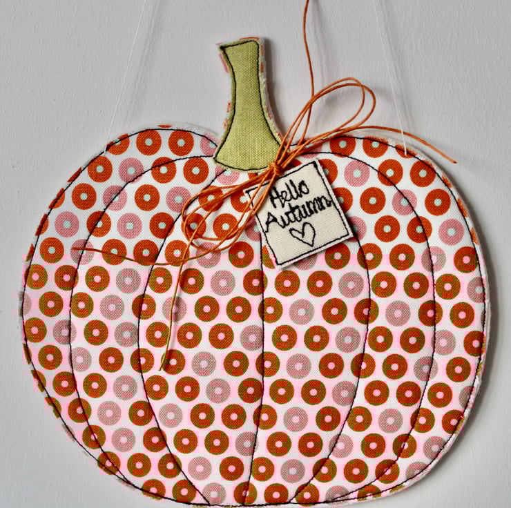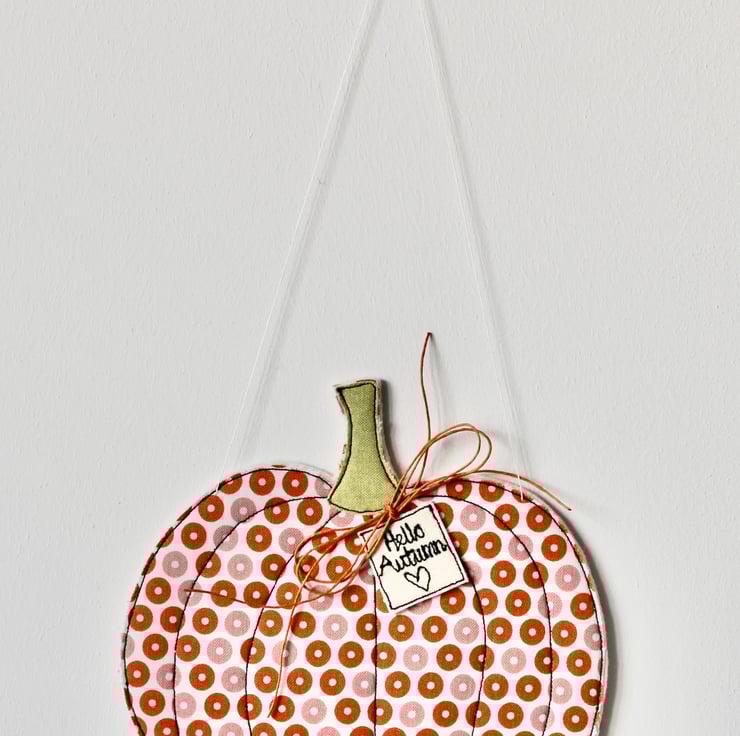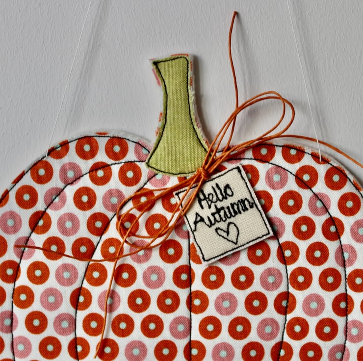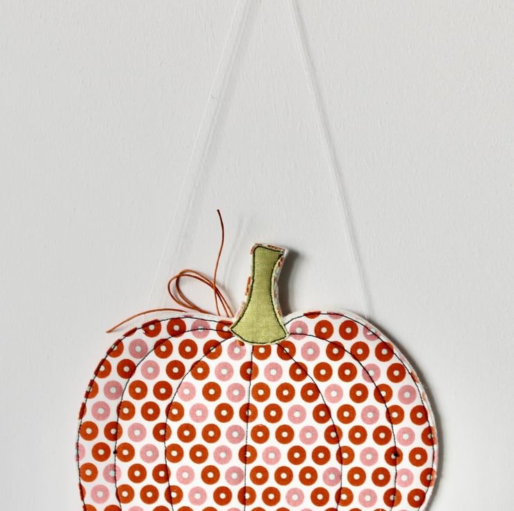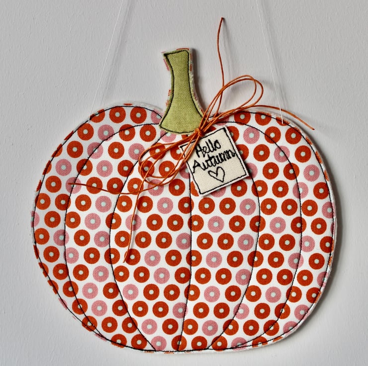 Each pumpkin is sewn using cotton cloth, 100% wool felt and free hand machine embroidery; multiple layers of cloth are sewn together and cut out by hand using very sharp scissors. With a linen string to suspend.
