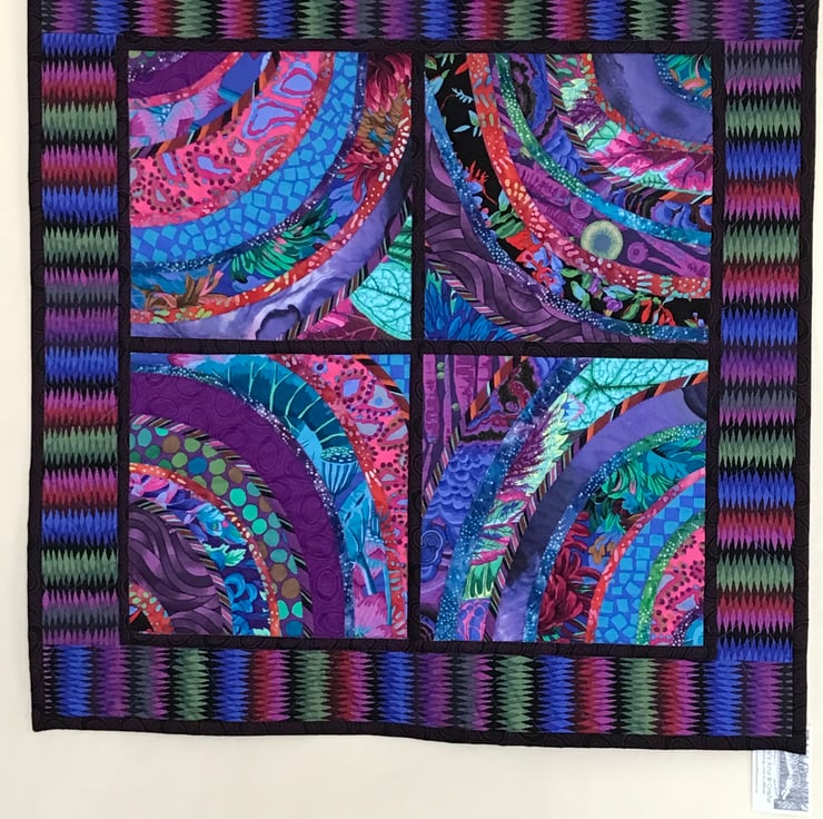 I am exploring new directions in textile art, among them the use of curves and the interplay of colour, pattern and texture, and the incorporation of hand painted and dyed fabric plus embroidery.