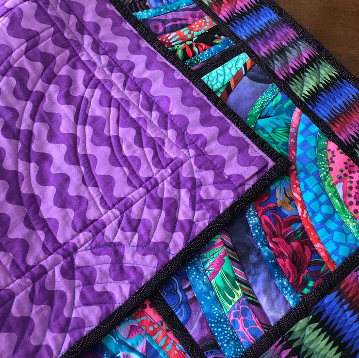 I was experimenting with curves and combining patterns to make four blocks, which can then be arranged in a variety of ways. The fabric pieces are joined with hand made bias binding of varying widths. The curved lines are very much a progression from my drawings and love of stripes.