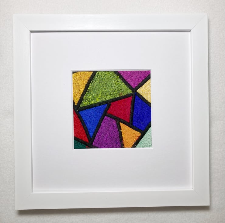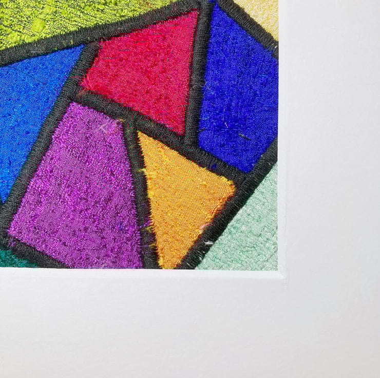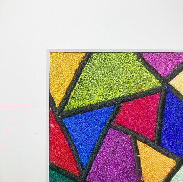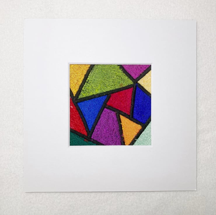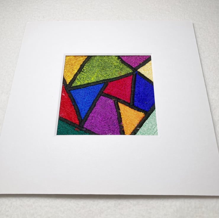 This piece of textile art has been made using brightly coloured silk fabric pieces that have been needle felted to a piece of backing felt. They fabric has been needle felted in a random geometric abstract pattern and each piece outlined with black stitching to give a "stained glass" effect. The needle felting process binds the fabric and fibres to the backing felt without the need for stitching. In addition to binding the fabrics, the needle felting creates a beautiful texture to the surface of the pictured the silk fabric has a lovely surface sheen. The picture has been provided with an 8' x 8" white card mount with a picture area of 4"x 4" ready to be framed.