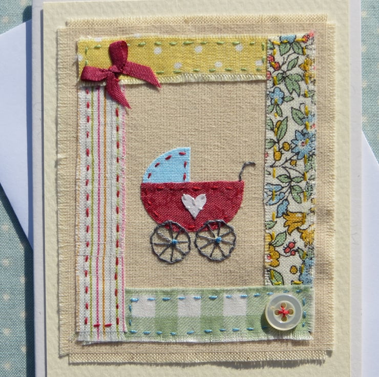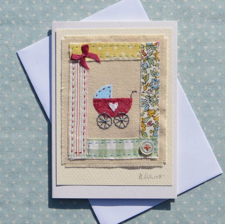Designed to celebrate the arrival of a new baby the miniature hand-stitched applique pram is bordered by pretty fabrics with a vintage mother of pearl button stitched into the design as well as a hand tied silk ribbon bow at the top. Hand embroidered details complete the miniature applique design. Suitable for boy or girl.