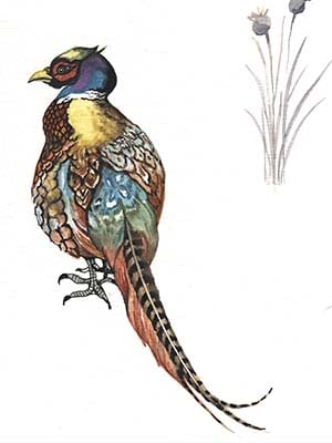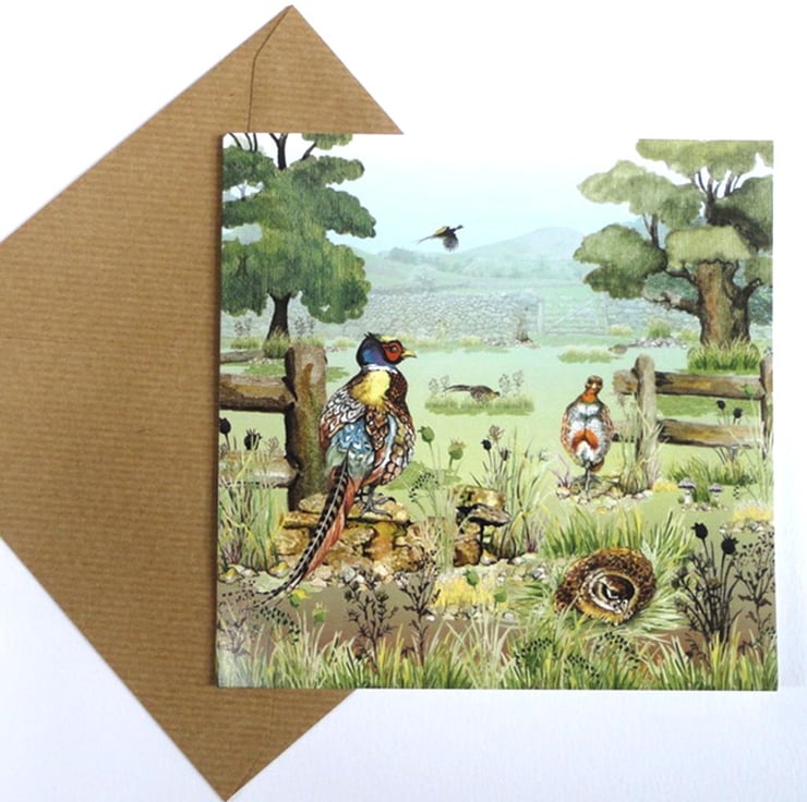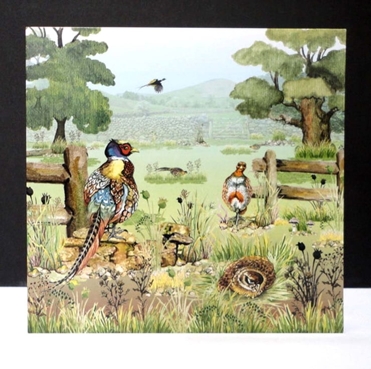The Pheasant and the Partridge really has that country feel of an early morning cross country walk. The handpainted pheasants are at home in this meadow. The beautiful proud male pheasant's plumage has so many gorgeous colours naturally melting into each patterned feather. The scene I have created with hand-painted and photographic elements, brought together in Photoshop, is reminiscent of my childhood in Yorkshire with the dry stone walls, open grassland with wooden fences, and rough areas of stones with dry grasses. The hen phesant is nestling in the grasses as a partridge strolls into the scene. I think this blank card is perfect for many occasions even the man in your life, Birthdays ,Christmas, Seasons Greetings or Thanksgiving card.