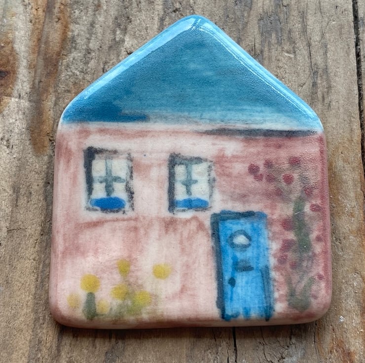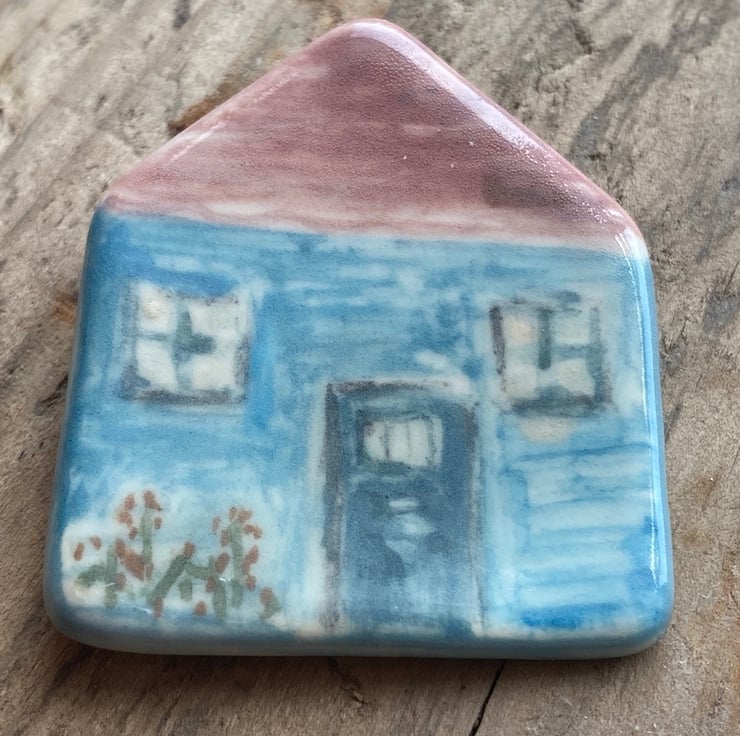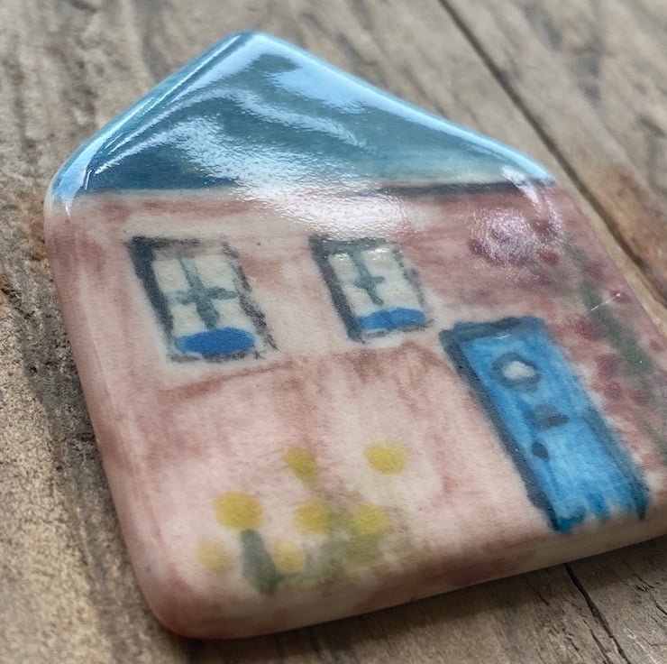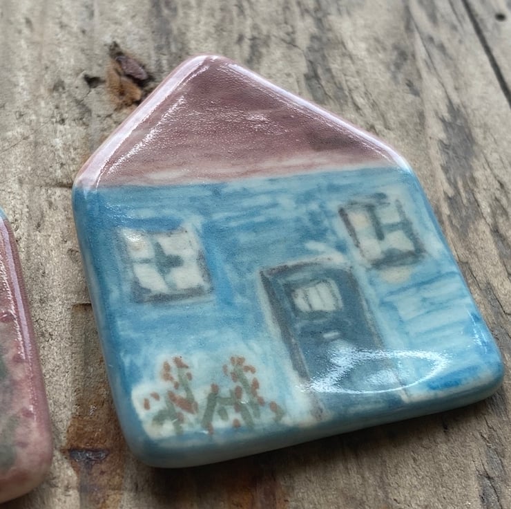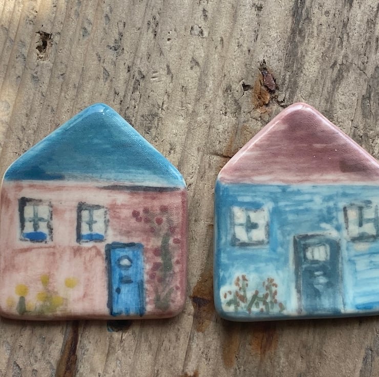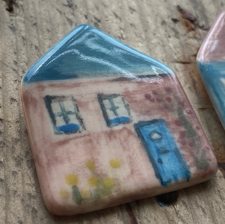Fabulous handmade Ceramic House Buttons. These buttons have been formed from Earthenware clay and twice fired in the kiln. Before the 1st firing they have been hand painted in underglazes to depict rustic cottages in contrasting Blue and Pink. After the first firing they have had 3 coats of a transparent satin glaze before undertaking their 2nd and final firing.