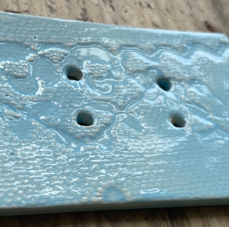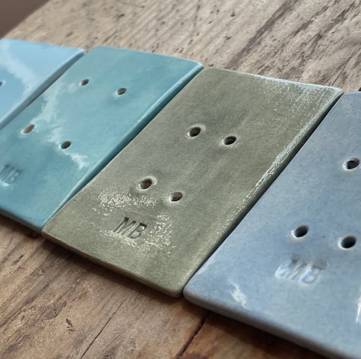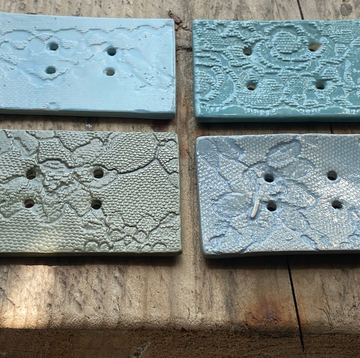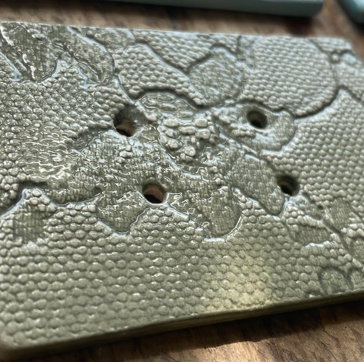 Fabulous handmade Ceramic Large Rectangular Buttons. These buttons have been formed from Earthenware clay and twice fired in the kiln. Vintage Lace has been used to imprint the beautiful pattern into the wet clay. Following the first firing they have been glazed in a mixture of Sea Green, beautiful Blue Grey, baby Blue and finally Sage Green.