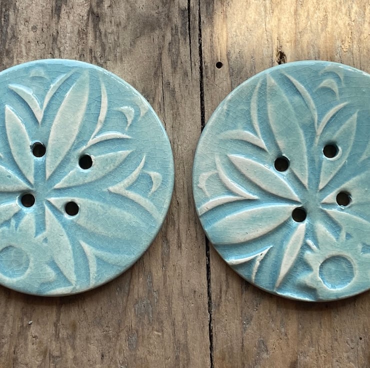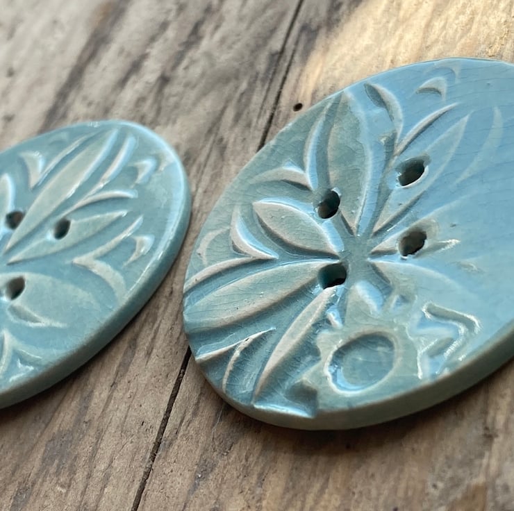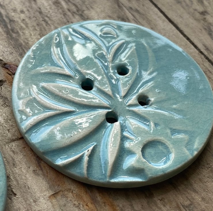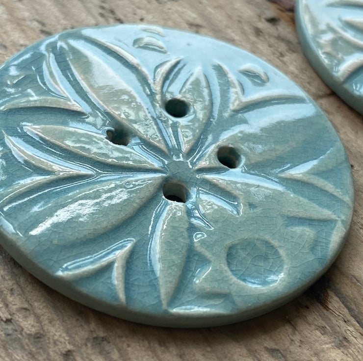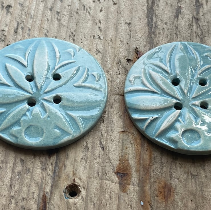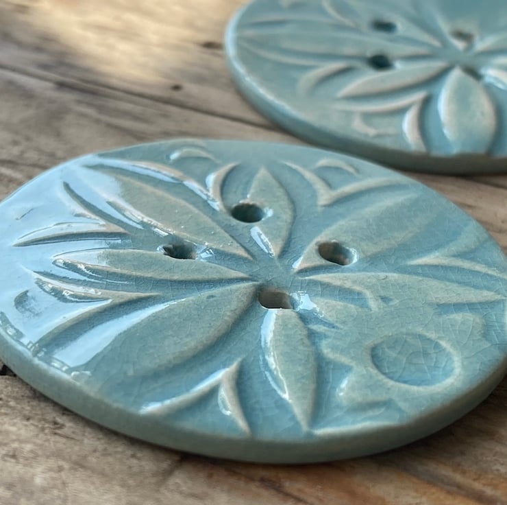 Fabulous handmade Ceramic Large Round buttons. These buttons have been formed from Earthenware clay and twice fired in the kiln. Printed using a stunning little antique wooden carved box to create this gorgeous pattern. Glazed using a soft sea green which highlights the pattern beautifully.