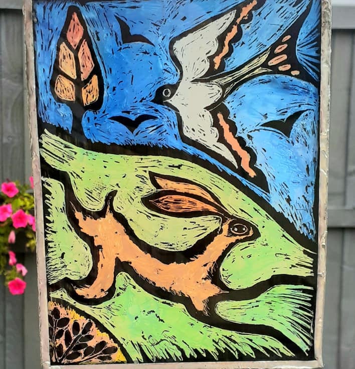 Made using the reverse glass painting technique where the back of the glass is painted black then etched out. The colours are then added behind.