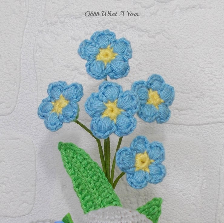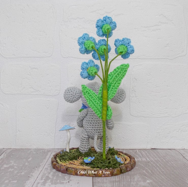 She is standing beneath a bunch of wired crocheted forget me nots which can be gently moved in to other positions.