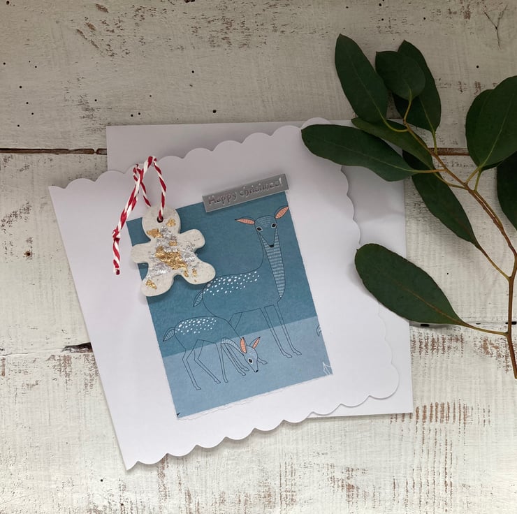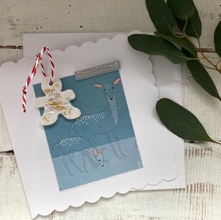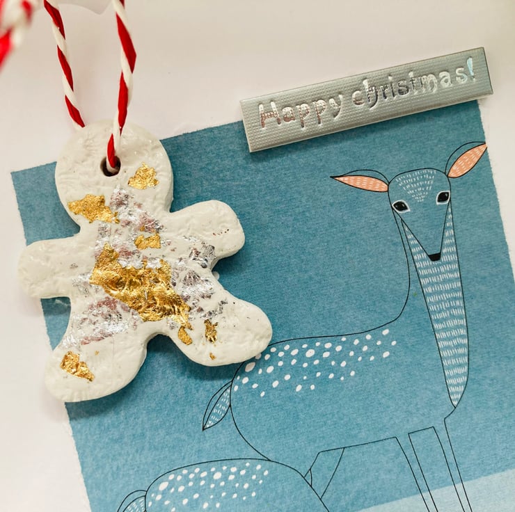 This gift card is perfect to give as a card and gift rolled into one. It has a cute Christmas gingerbread man made from a white air dry clay attached to the front of the card which can be taken off and used to hang around the home or on your Christmas tree. It is painted in white acrylic paint and decorated with gold and silver leaf to make it sparkle.