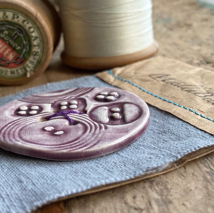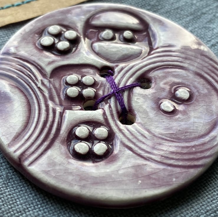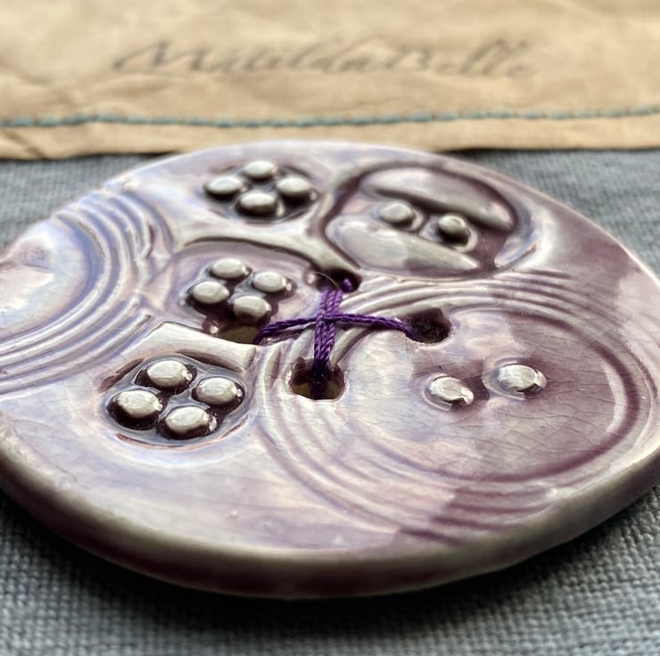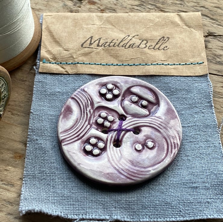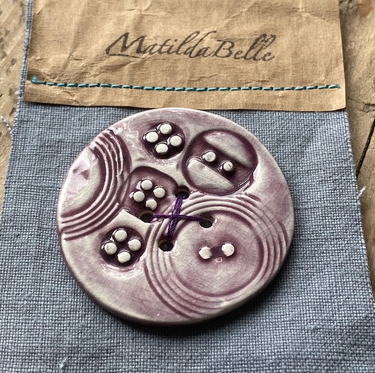 Fabulous handmade Ceramic Large Round button. This beautiful button has been twice fired in the kiln. Before its firings it has been imprinted with gorgeous old buttons from my Nanas button tin and glazed in a Purple.