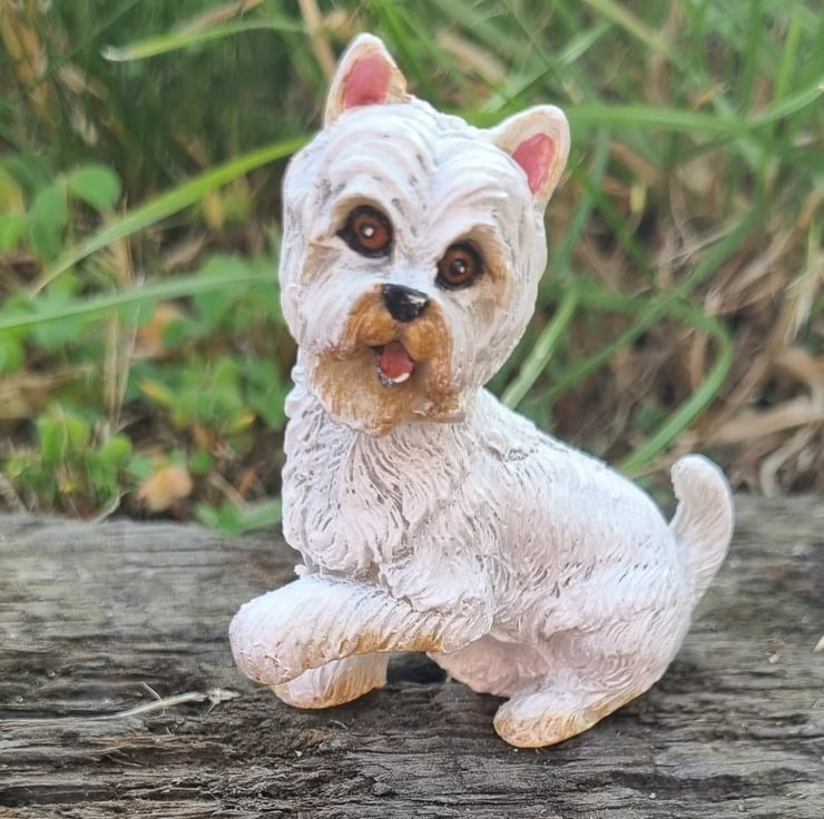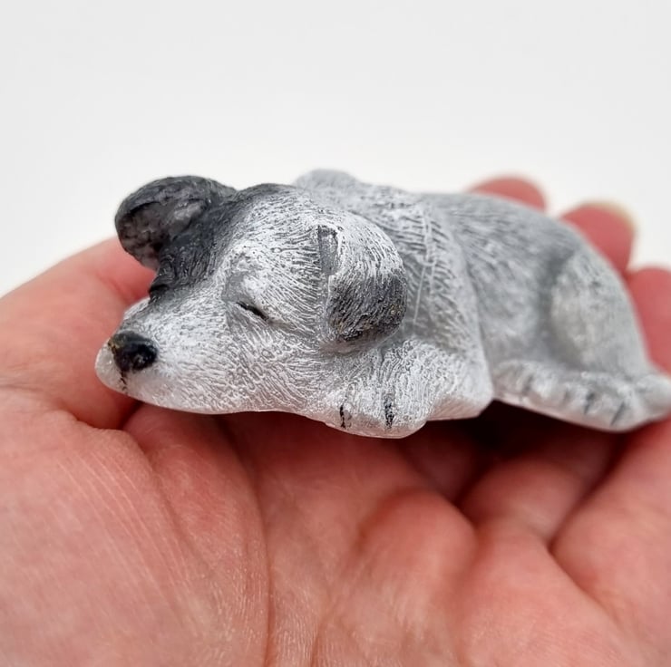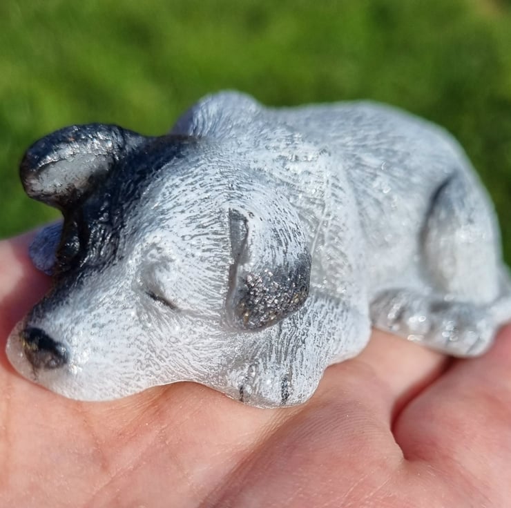 This dog keepsake is made incorporating cremation ash provided by the customer and then hand painted in their likeness, Dimensions approx 8.5 x 4,5 x 2.5cm.