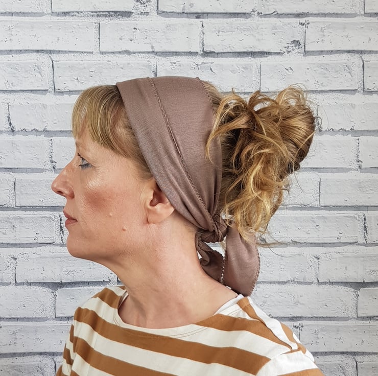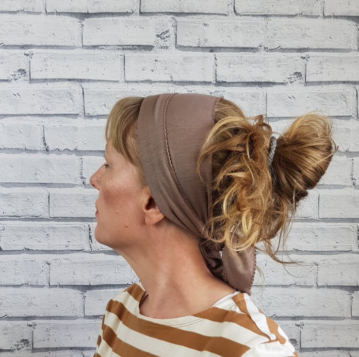 A jersey headscarf designed not to slip. The scarf is made up of two layers of this lovely soft viscose fabric which are sewn together with a decorative stitch. To wear simply tie the scarf at the nape of the neck and fold back at the front.