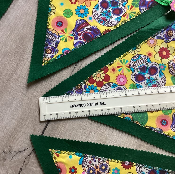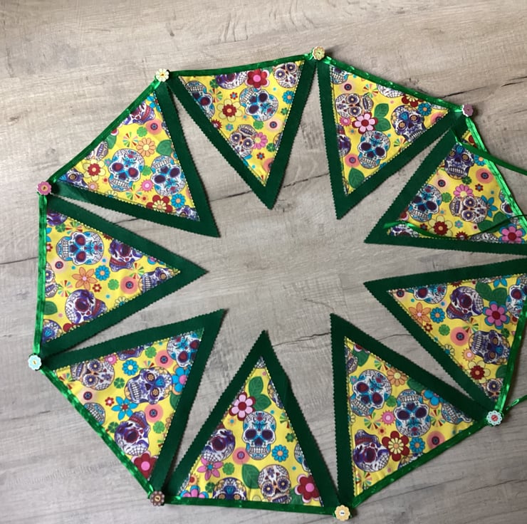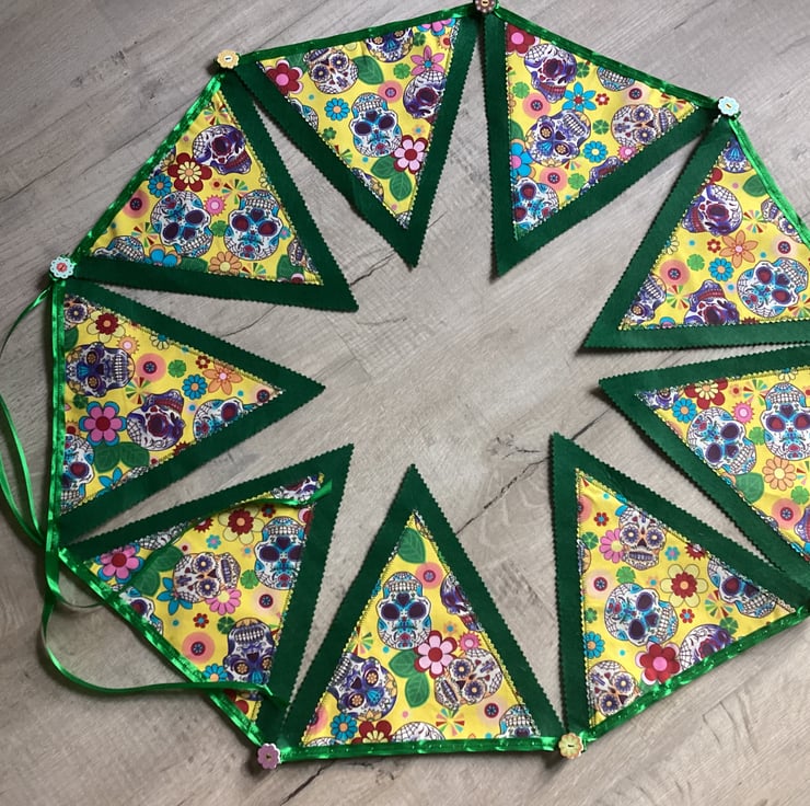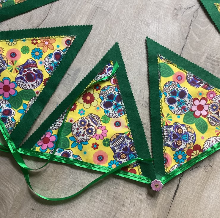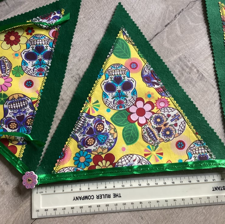 Funky floral skull cotton look stunning on green felt base fabric . I’ve used felt for better support on each flags, satin ribbon for string and colourful wooden buttons for decoration .