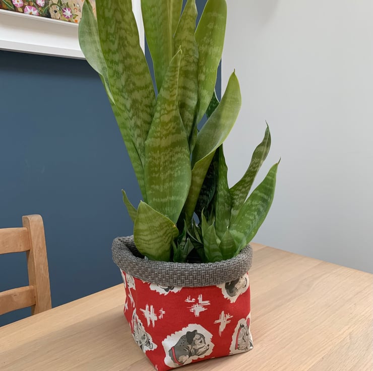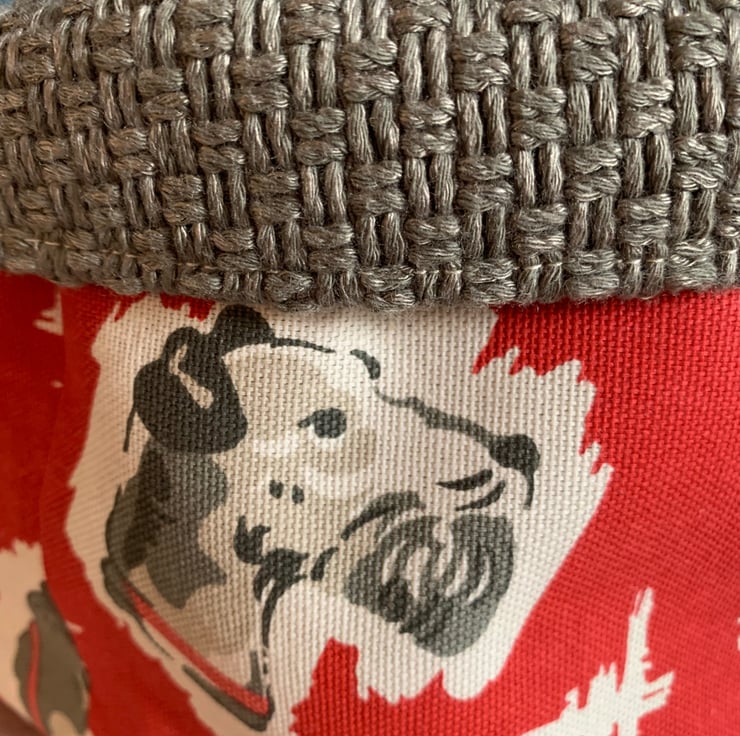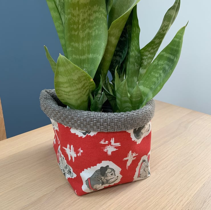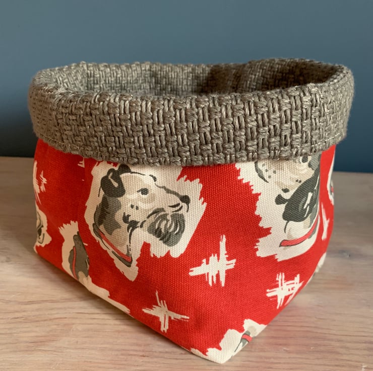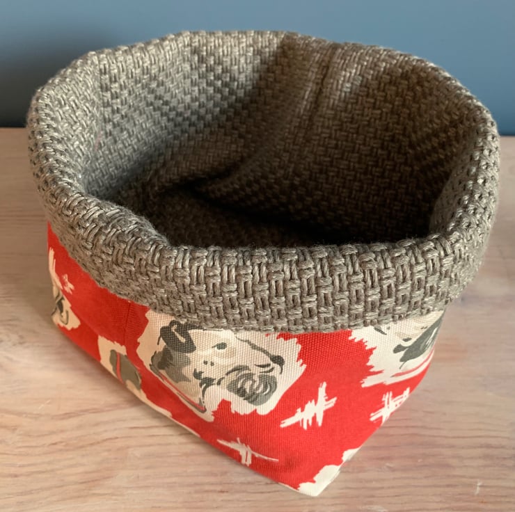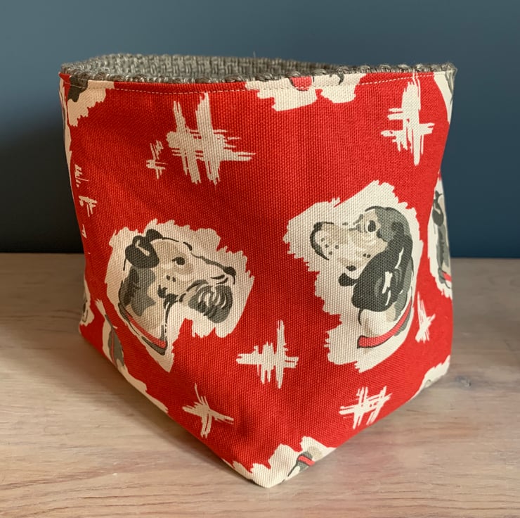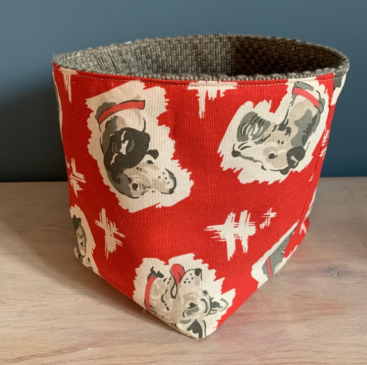 Reversible fabric storage basket made from cute dog print fabric with a red background and thick textured grey upholstery fabric. Can be used with a turn-down to make the most of the contrasting fabrics.