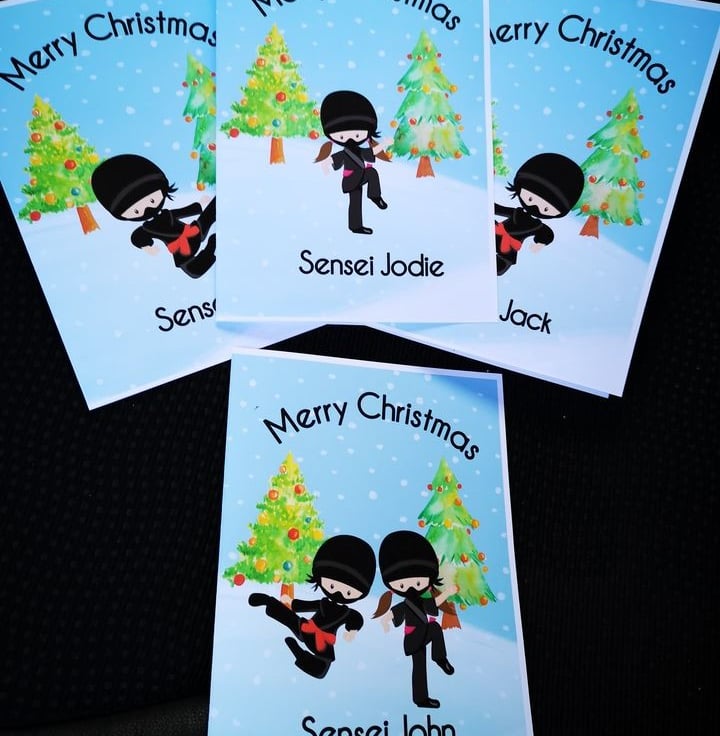 The card can be personalised with you or your child's martial arts teachers names, or could say Merry Christmas from you or your child's name. These could be used for your Martial Art's loving kid to give to their friends or family. Please advise what message you would like on the card, what colour belt you'd prefer (red with short hair or pink with long hair) and if you require extra cards by answering the questions when ordering.