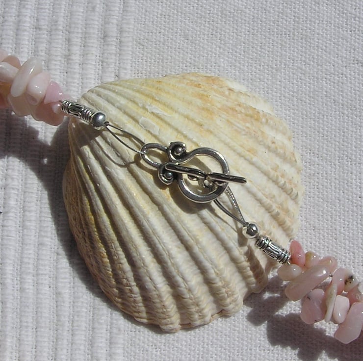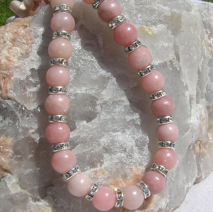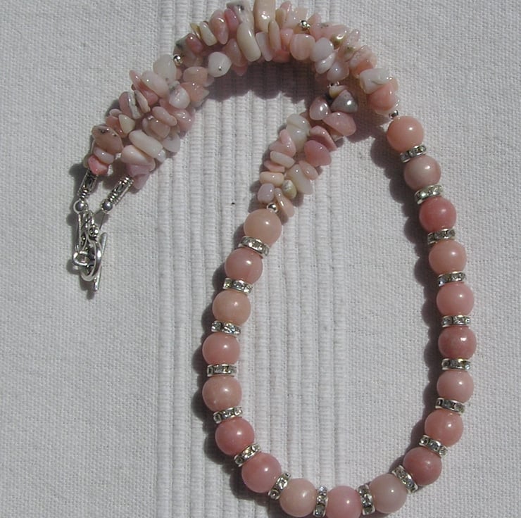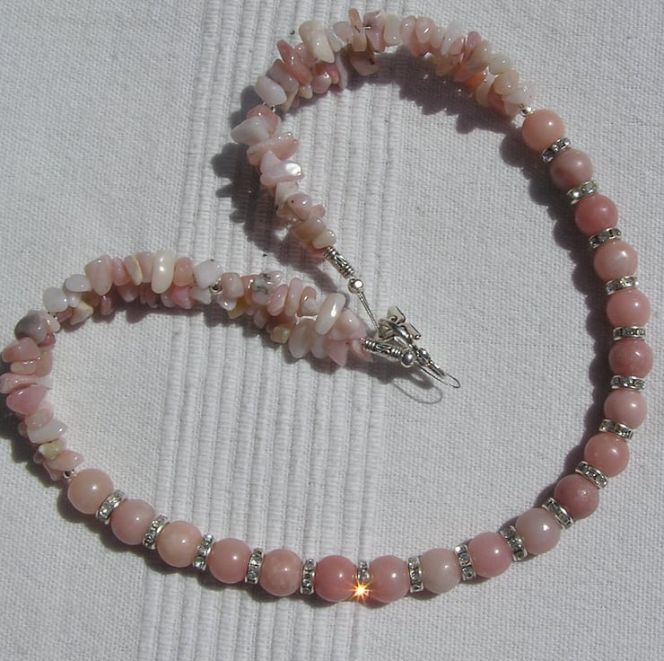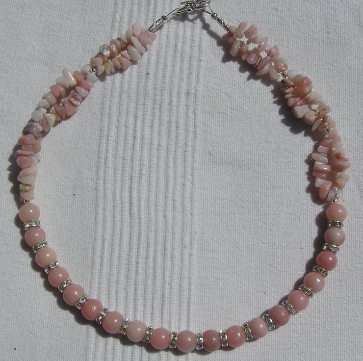 This Stunning Necklace is made wholly from Pink Opal... sumptuous round beads alternated with Glistening Crystal studded spacers finished by double-stranded Pink Opal Gem-Stone Chips - a Gorgeous soft effect that will look stunning either worn casually or with something more Elegant for a Special Evening out
