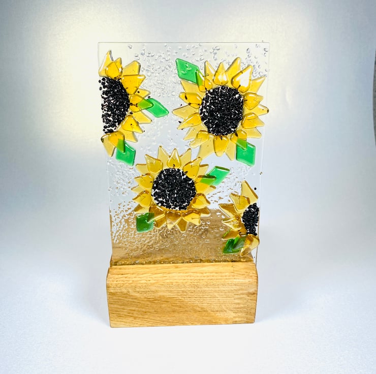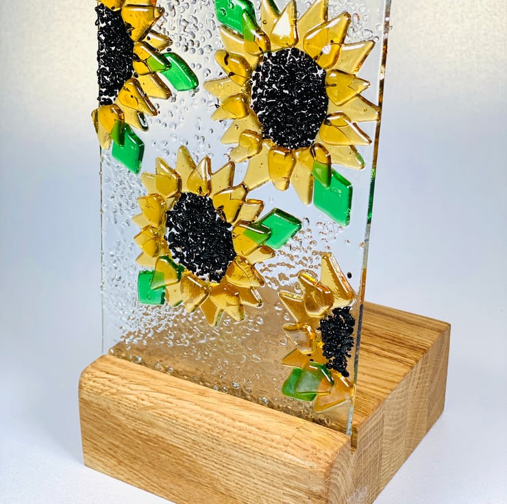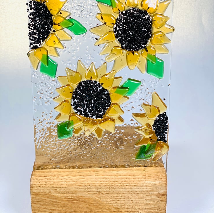 Gorgeous fused glass sunflower ornament which will add light and interest anywhere in your home . The fused glass sunflower is made by hand and kiln formed to give a contoured textural look . The glass is luminescent and texture is added with clear glass . A beautiful gift for the home - perfect anywhere in the home