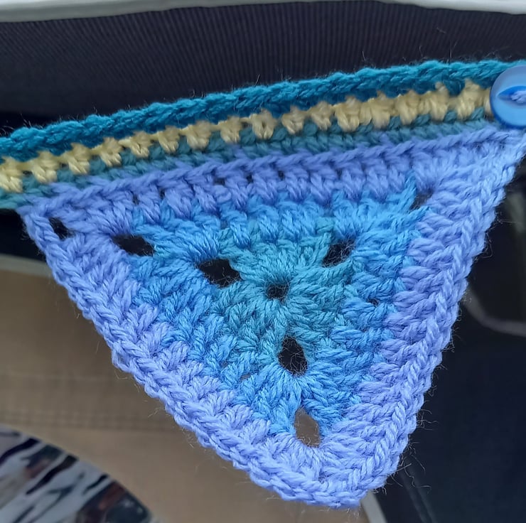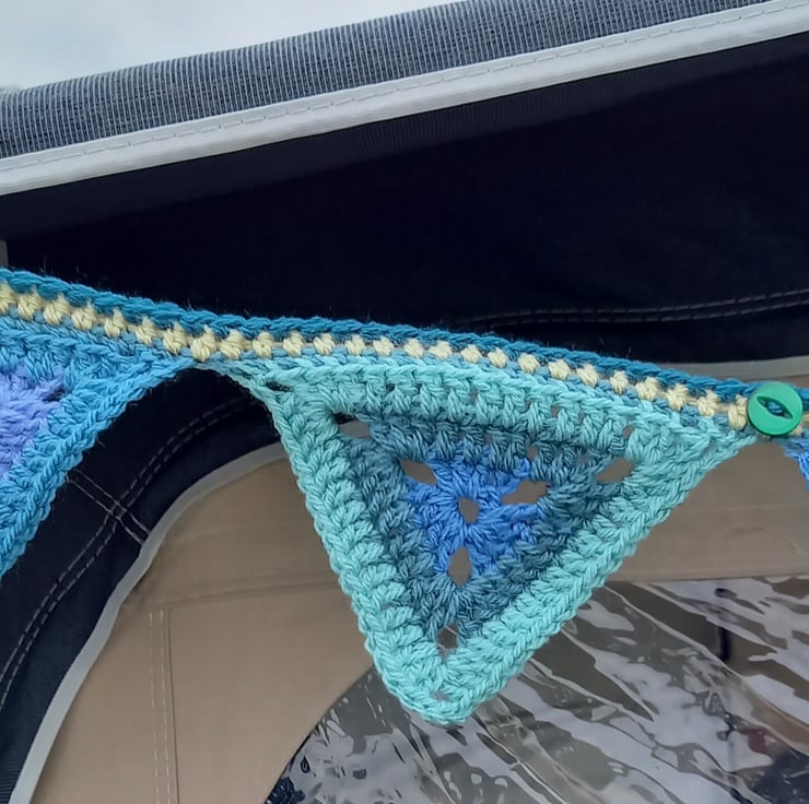 The bunting is made up of 15 individual crocheted triangles each measuring 10cm x 10cm x 10cm.
