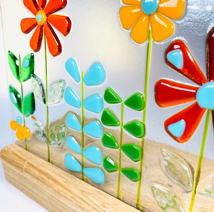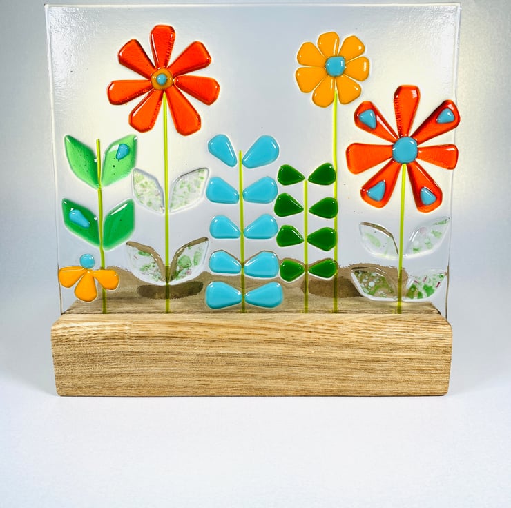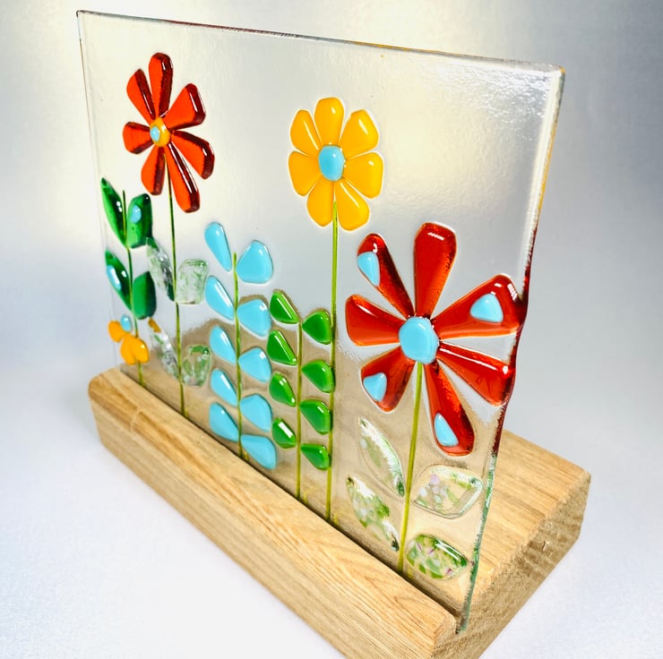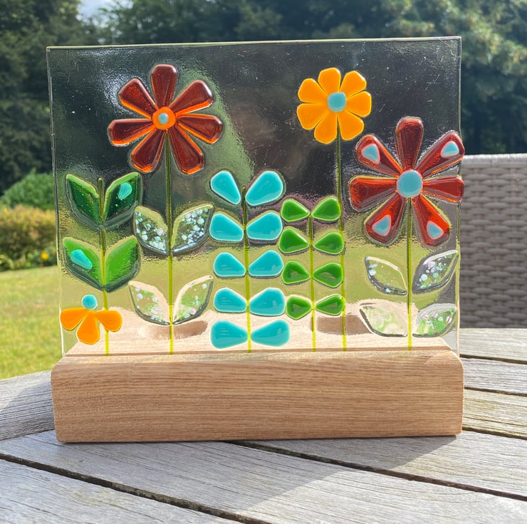 Beautiful fused glass art panel which sits within an oak base. Hand crafted fused glass all hand cut and kiln formed . Art slots into a groove in the oak base for ease of cleaning and transportation.