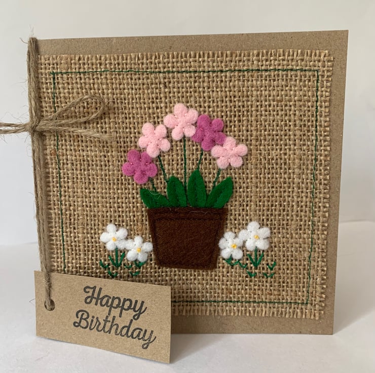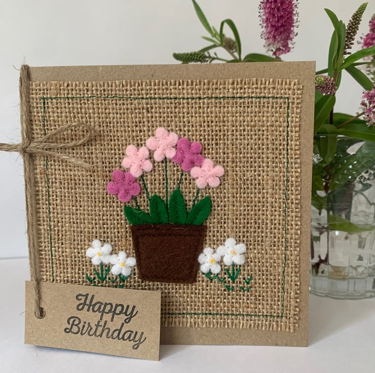This handmade birthday card is decorated with potted flowers in rose pink, pale pink and white. The decoration is hand cut from 100% wool felt. It is then sewn by hand and machine onto a hessian background.