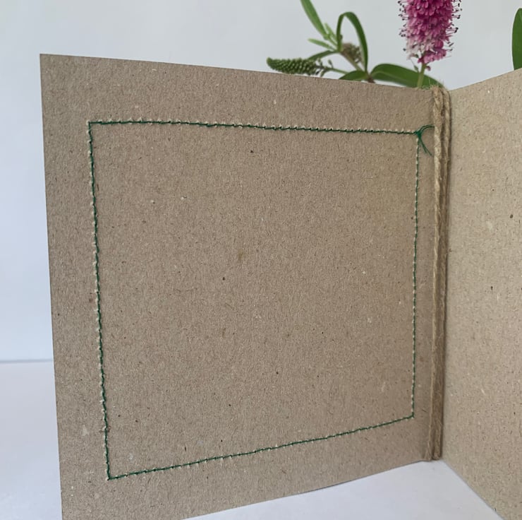 The hessian is machine stitched, using a contrasting thread, onto a plain brown recycled card. This stitching is visible on the inside of the card.