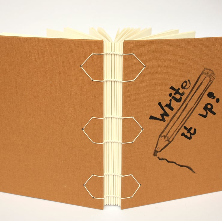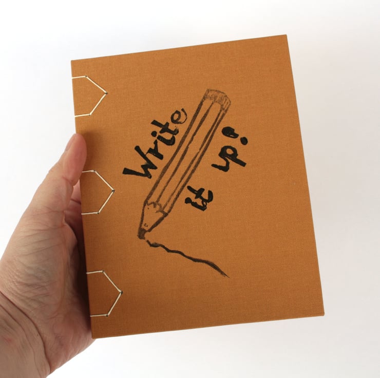 This nice little journal or notebook has covers wrapped in bookbinder's linen with a hand cut lino design printed on the front cover. It shows a pencil drawing a line, and has text saying "Write it up!"