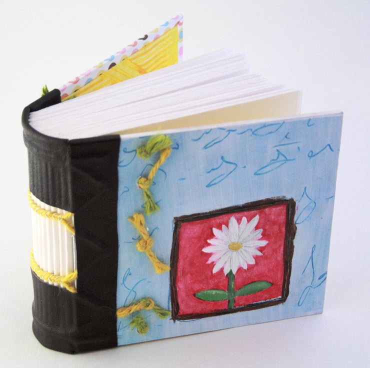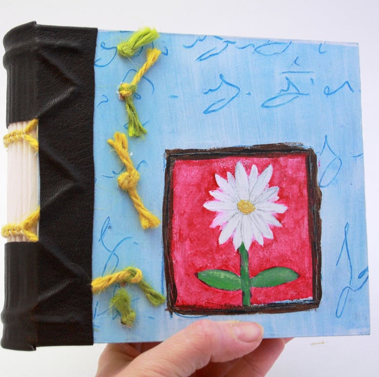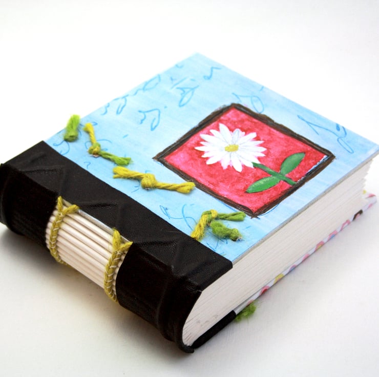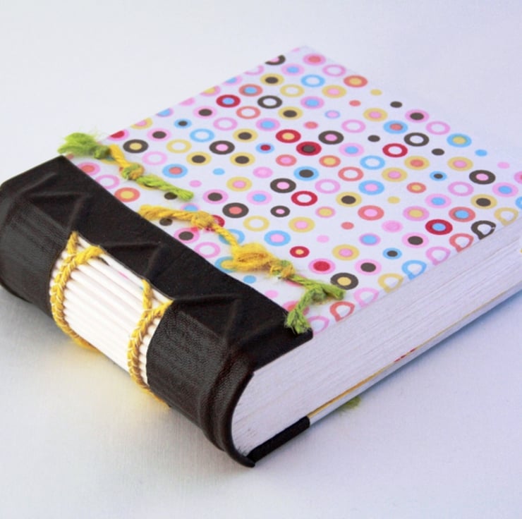 This chunky journal is bound in a medieval technique but has been given a contemporary look. The front cover is painted by me, the back cover is covered in a colourful dotted fabric and the spine is lined with a dark brown leather.