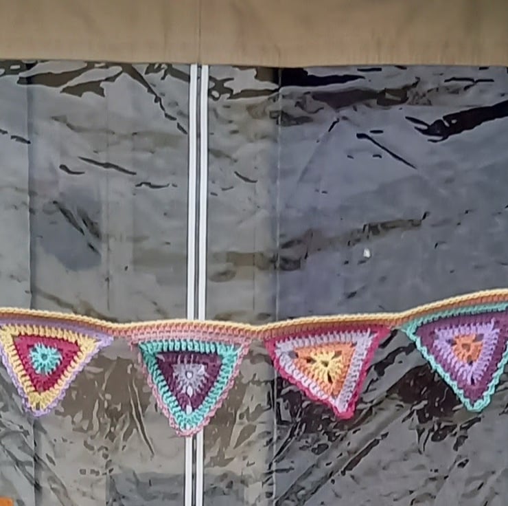 The bunting is crocheted in acrylic yarn and therefore washable and will not stain any awnings, tents or fencing if it becomes wet.