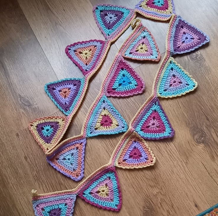 Hand crocheted bunting in pastel shades of pink, lilac, peach, turquoise, cream, with a peach and cream top border finished with crocheted loops at both ends, with a lacy border around the sides of each triangle.