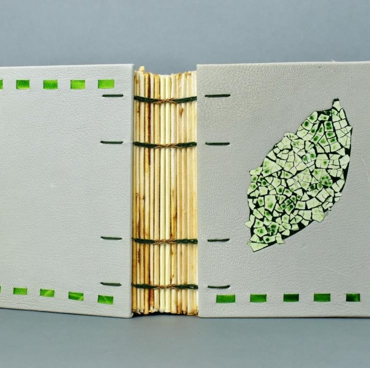 The boards are covered in a slightly greenish-white goatskin, decorated with parchment bits and an eggshell panel.