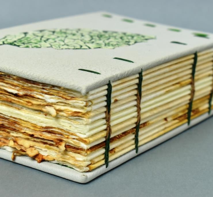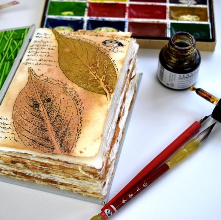 Eco- dying is a technique for which I first collected leaves in autumn, sandwiched them between the paper, and steamed it, so that the natural pigment from the leaves, transferred to the paper.
