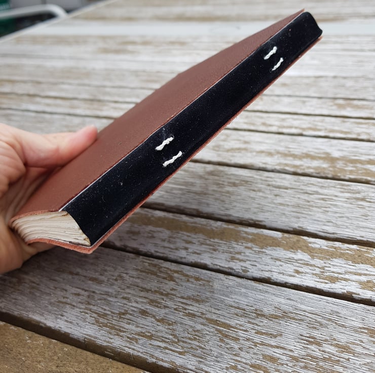 For the bookbinding experts: The binding style is called a secondary tacket binding. The book block has been sewn unto tapes which are secured between the covers and the paste-down. The stitches visible on the spine only attach the velvet spine to the book's spine and provide additional cohesion - but are not needed to keep the book together.