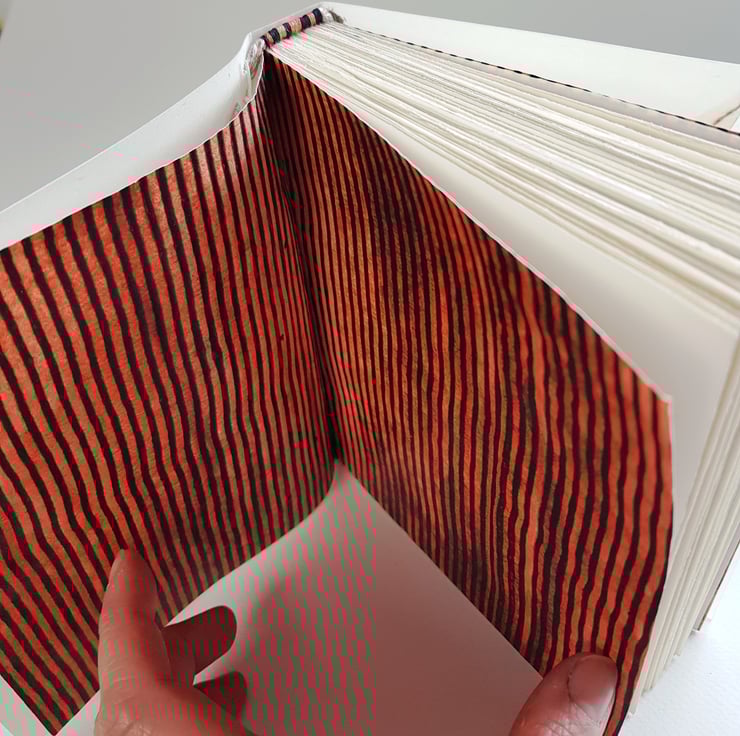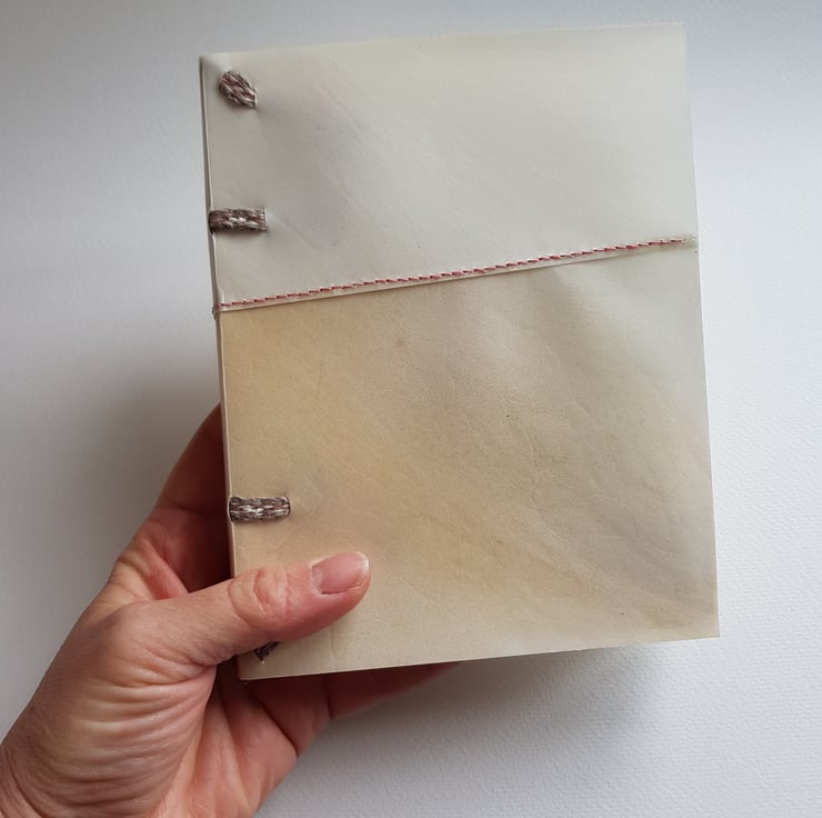 The cover for this unique book is made from stitched together pieces of parchment and vellum. On the inside covers you see patterned paper which is hand decorated paste paper.