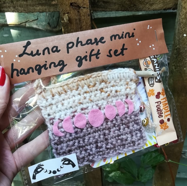 This little gift set contains a crocheted little wall hanging with the lunar phases in felt. The top is a piece of driftwood.
