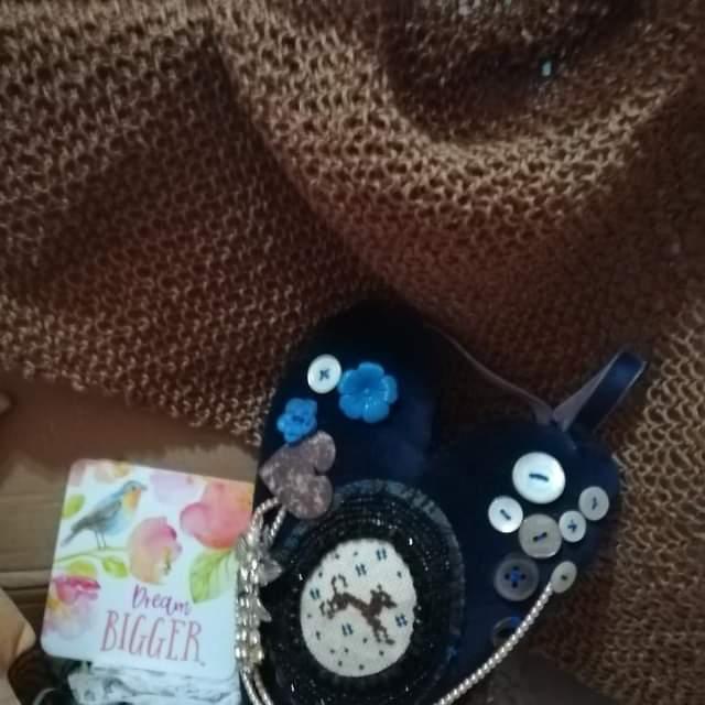 A deep blue velvet textile trinket art heart wall hanging, hand stitched vintage trinkets and a small dog cross stitch motif