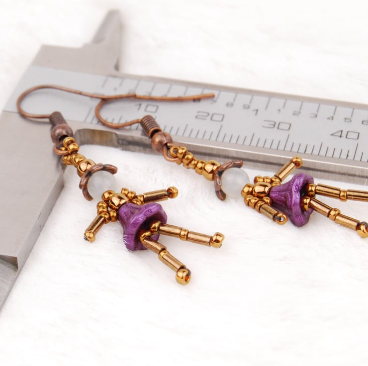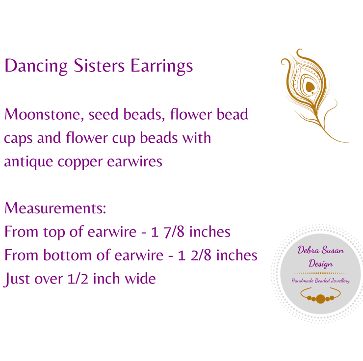 These fun earrings are made with moonstone, glass beads, and antique copper bead caps and ear wires. They are like little fairies dancing as they hang from your ears so I call them the Dancing Sisters. With their little purple flower skirts, round moonstone heads, and tiny bronze seed bead feet these little ladies are so adorable.