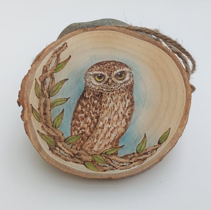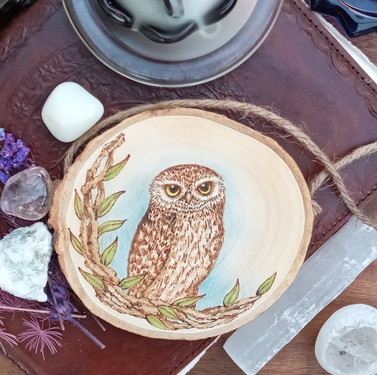 It's created using pyrography, which is burning on wood, and coloured with acrylic ink. The piece is finished with non toxic linseed oil.