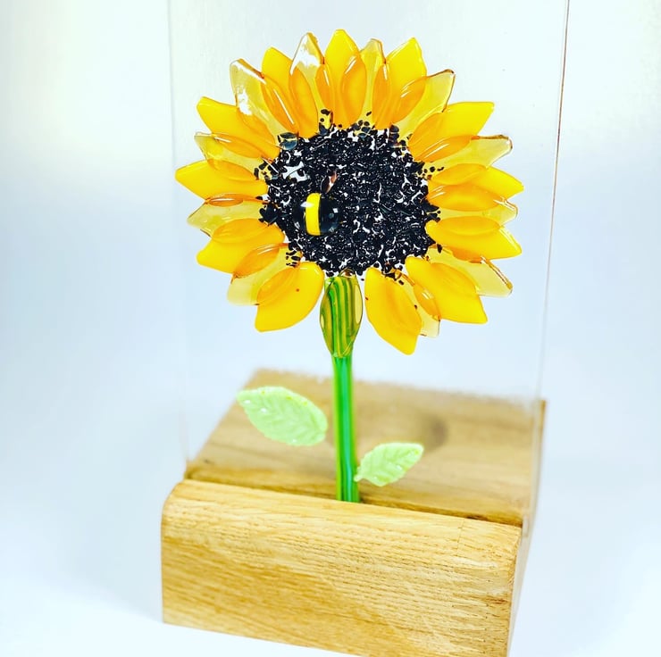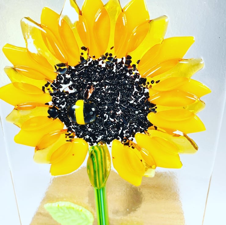 So pretty this sunflower is one of a kind and is made using transparent and opaque glass and has a bee in its centre . The glass art panel sits within an oak base but can be detached for ease of cleaning and transportation.