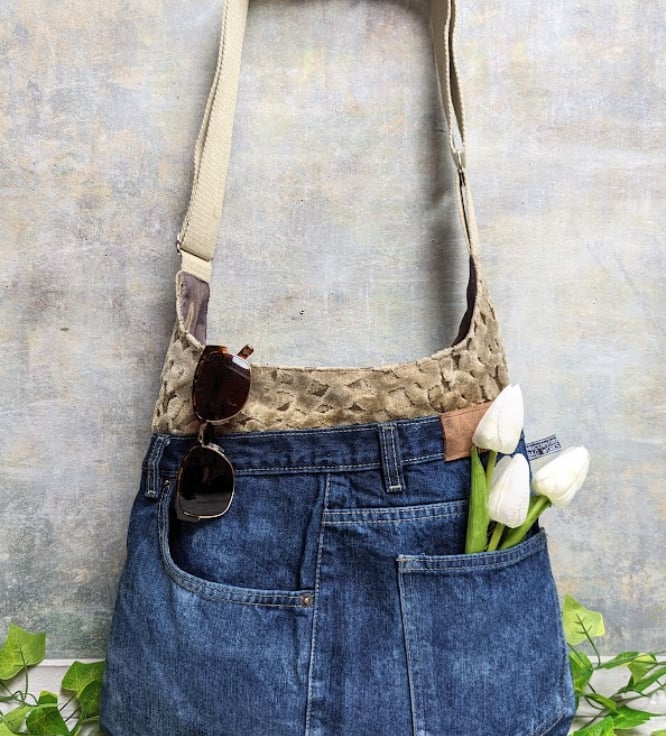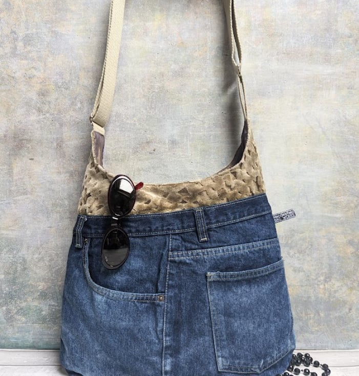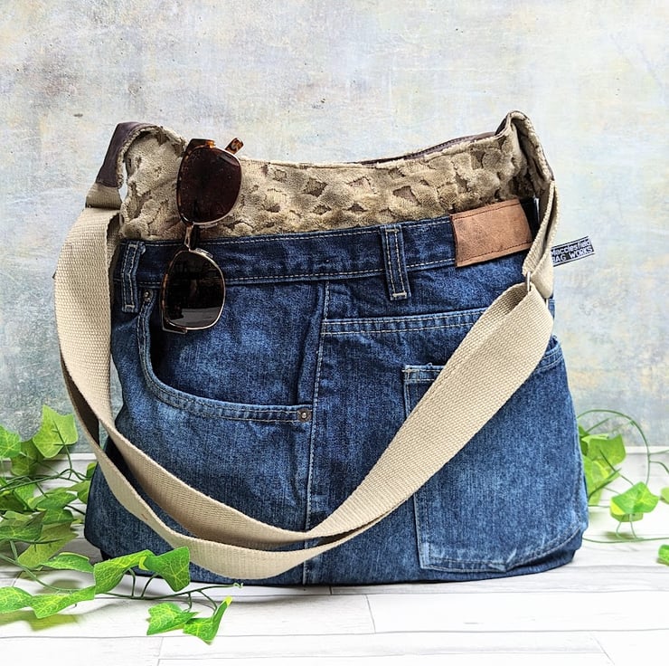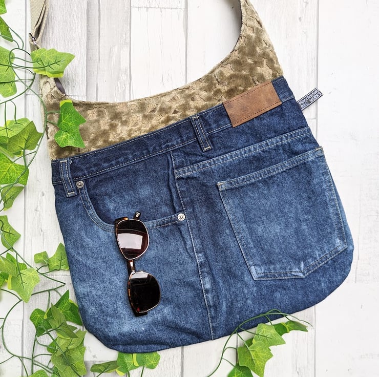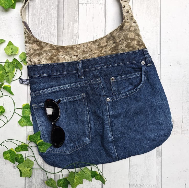 Dark, indigo, pre-loved denim has been scrubbed with pumice and a light bleach solution (don't worry, it's been washed very well afterwards!!) to give it a unique, lived in look. Teamed with champagne coloured chenille and add in LOTS of pockets and this hobo shoulder or cross body bag is a perfect day through to evening bag. A heavyweight, mink coloured taffeta lining adds an extra touch of opulence.