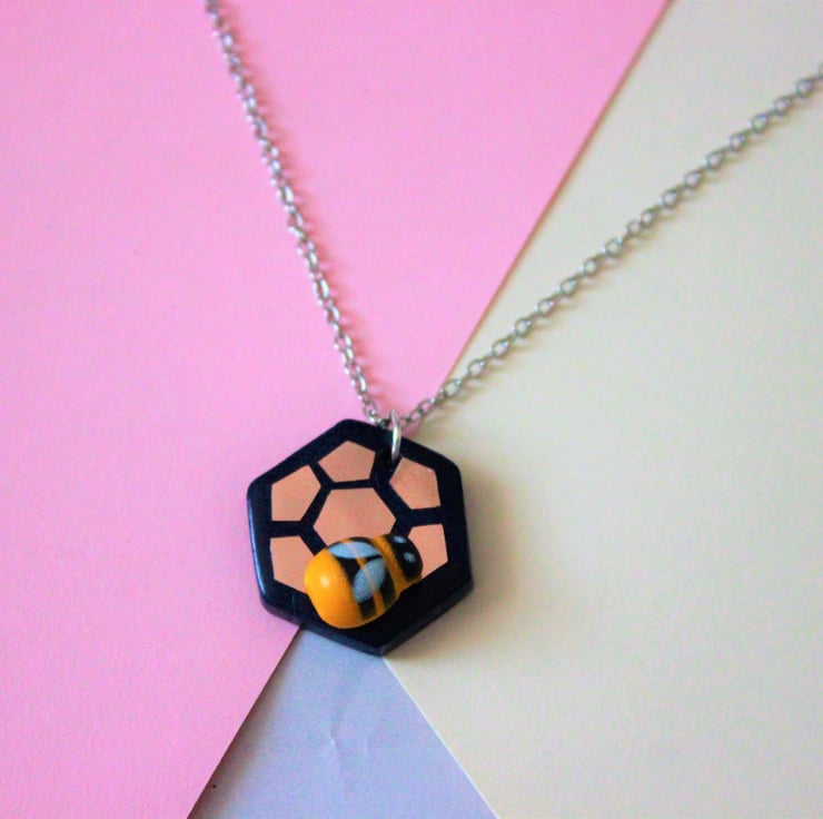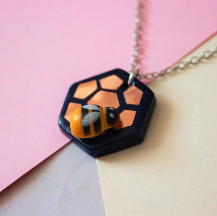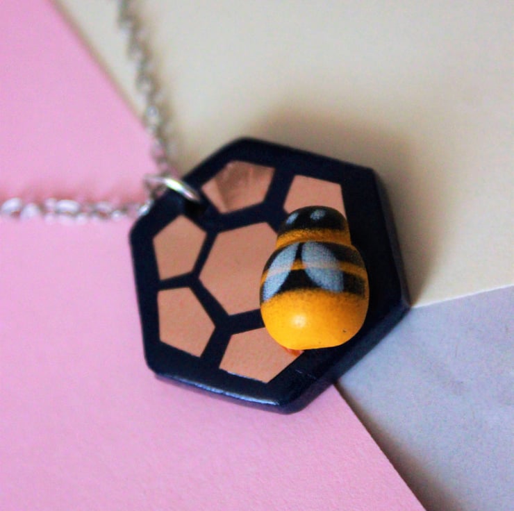 Hexagon necklace made with navy polymer clay. Beehive style design added to the clay using rose gold foil. A small wooden bee has been superglued to the hexagon.