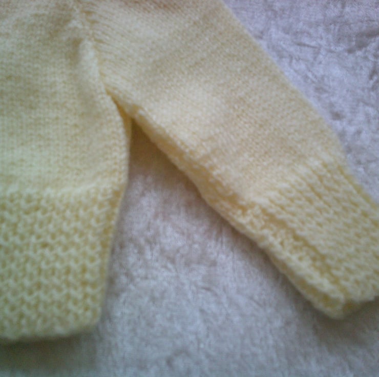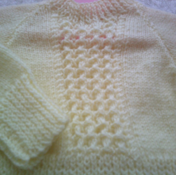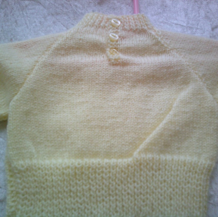 This hand knitted Round neck lemon jumper has a lacy panel up the centre of the front and raglan sleeves. It had buttons at the back of the neck to make it easier to put on and take off of baby.