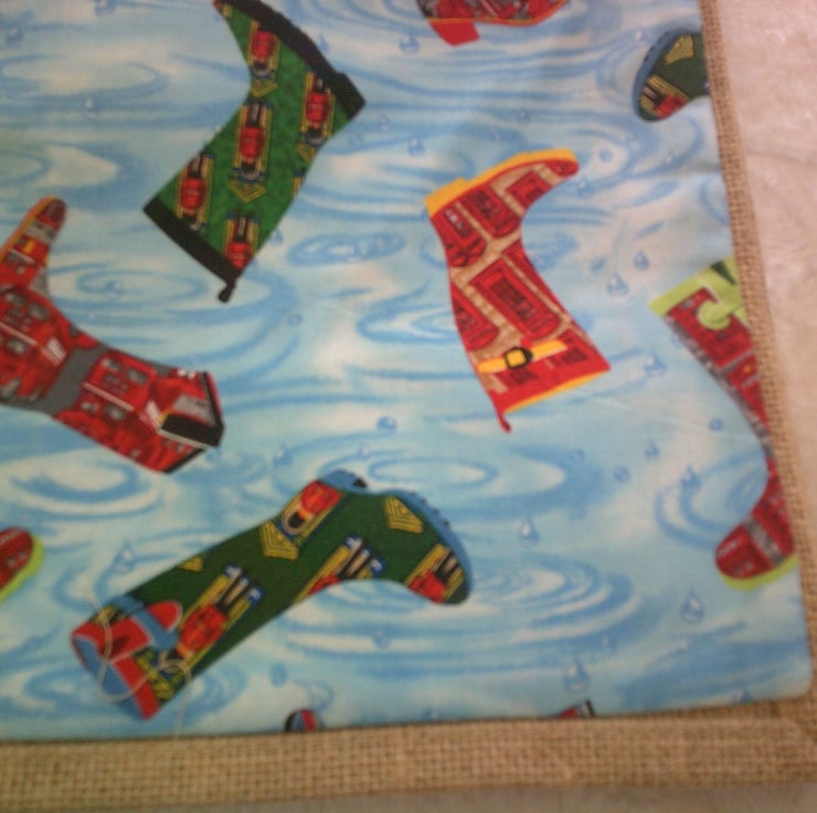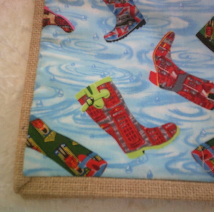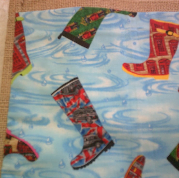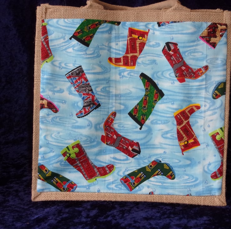 The bag itself measures approximately 30 x 30 x 20 cm (12 x 12 x 8 inches). The fabric pocket - which has been hand sewn onto the bag is a panel featuring wellington boots and cowboy boots depicting various iconic British Scenes including red telephone boxes, black taxis on Union Jack Flags, Red Route Master Buses and guards in their sentry boxes on a background that looks like water.