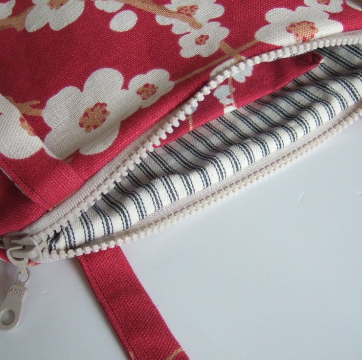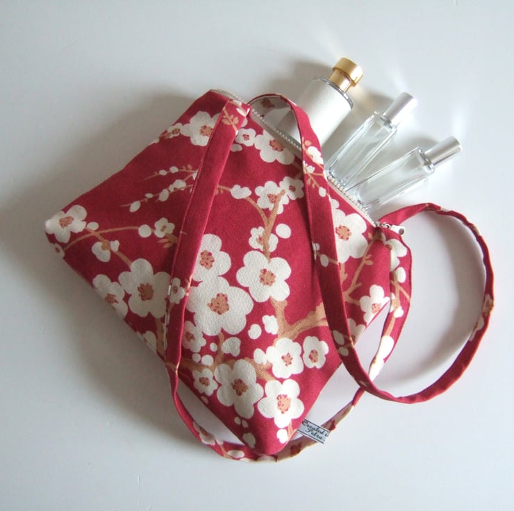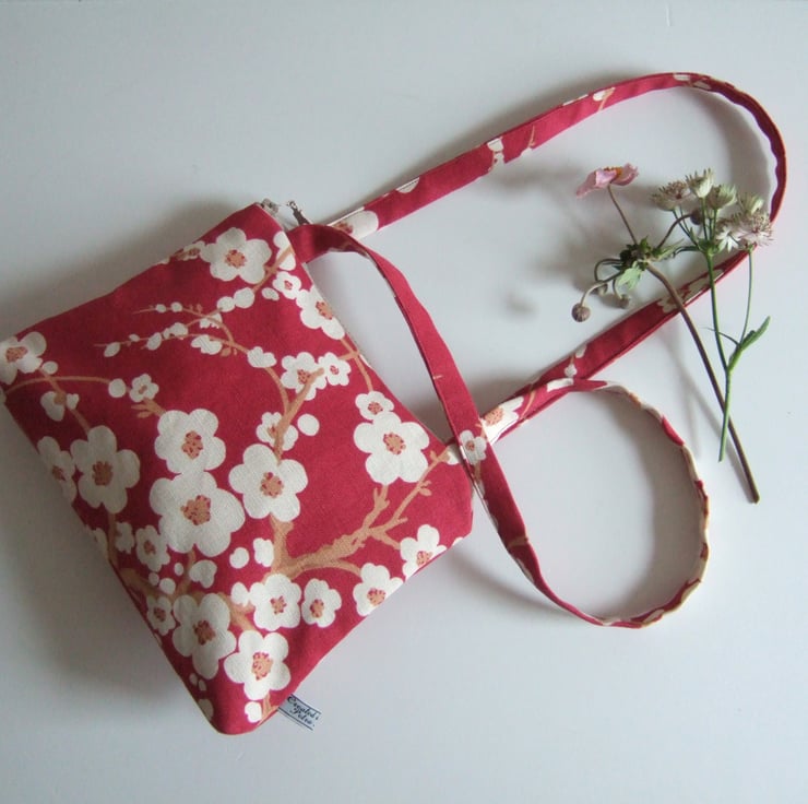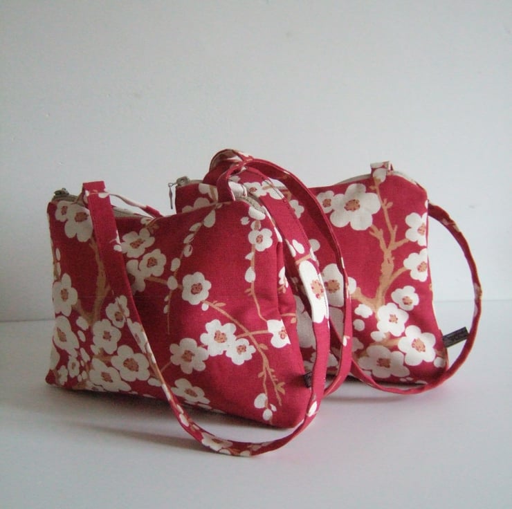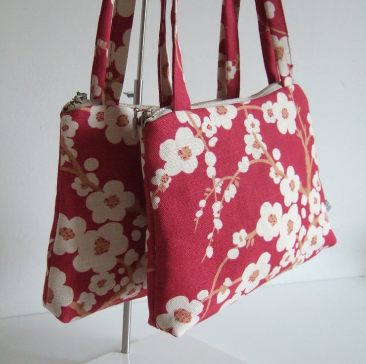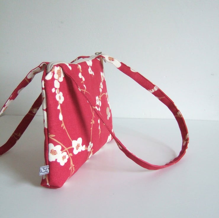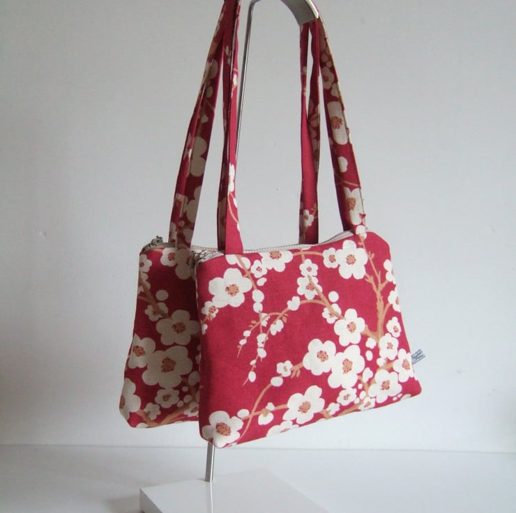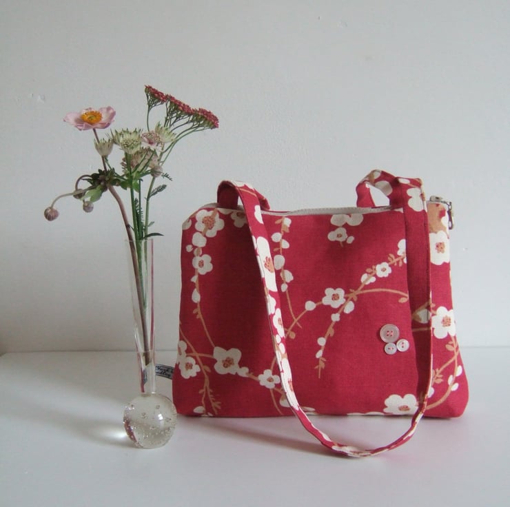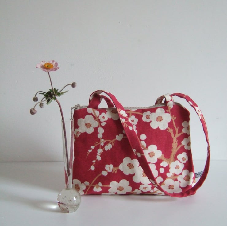 This neat and practical little shoulder bag or handbag is in my sale section to make room for new items. It is made in a pretty Japanese style cherry blossom print, and closes with a satisfying chunky zip. It has two long straps, and an internal pocket to keep the flotsam and jetsam of your life organised. Although it fits neatly under your arm, it is still large enough to carry all your essentials with style. It would make a great present for a friend who loves all things Japanese, or as the perfect bag to take to a summer wedding